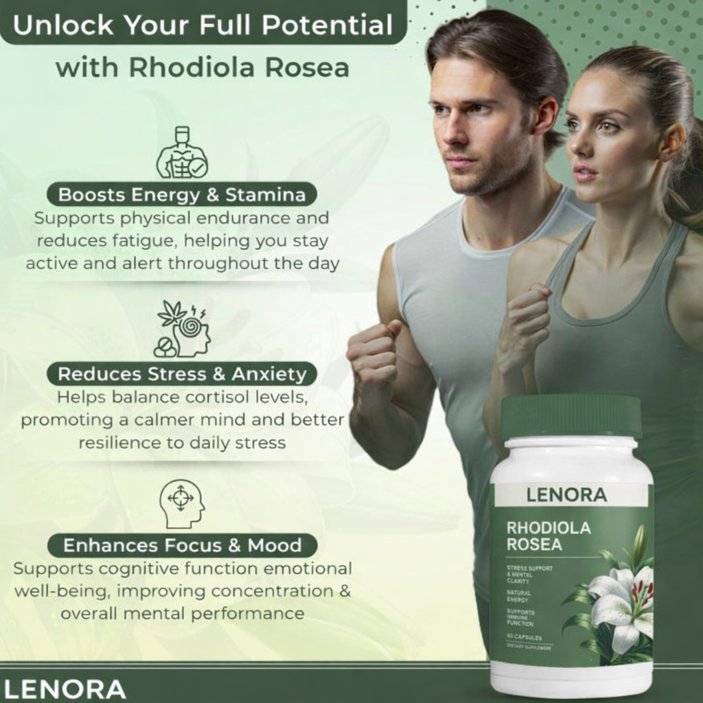 Lenora Rhodiola Rosea Extract is a natural dietary supplement made from the root of the Rhodiola rosea plant. It’s classified as an adaptogen, meaning it helps your body better manage stress while supporting steady energy, focus, and mental clarity.